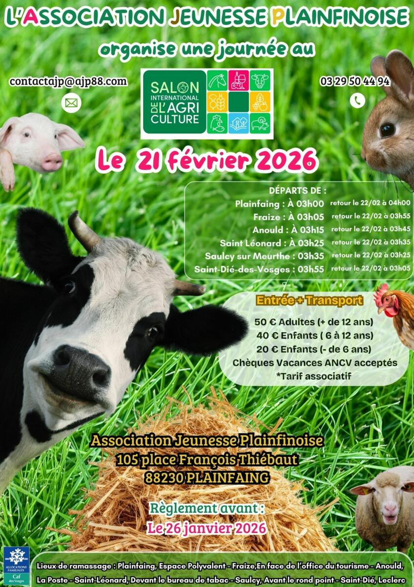 L'Association Jeunesse Plainfinoise organise une journée au salon international de l'agriculture le 21 Février 2026.