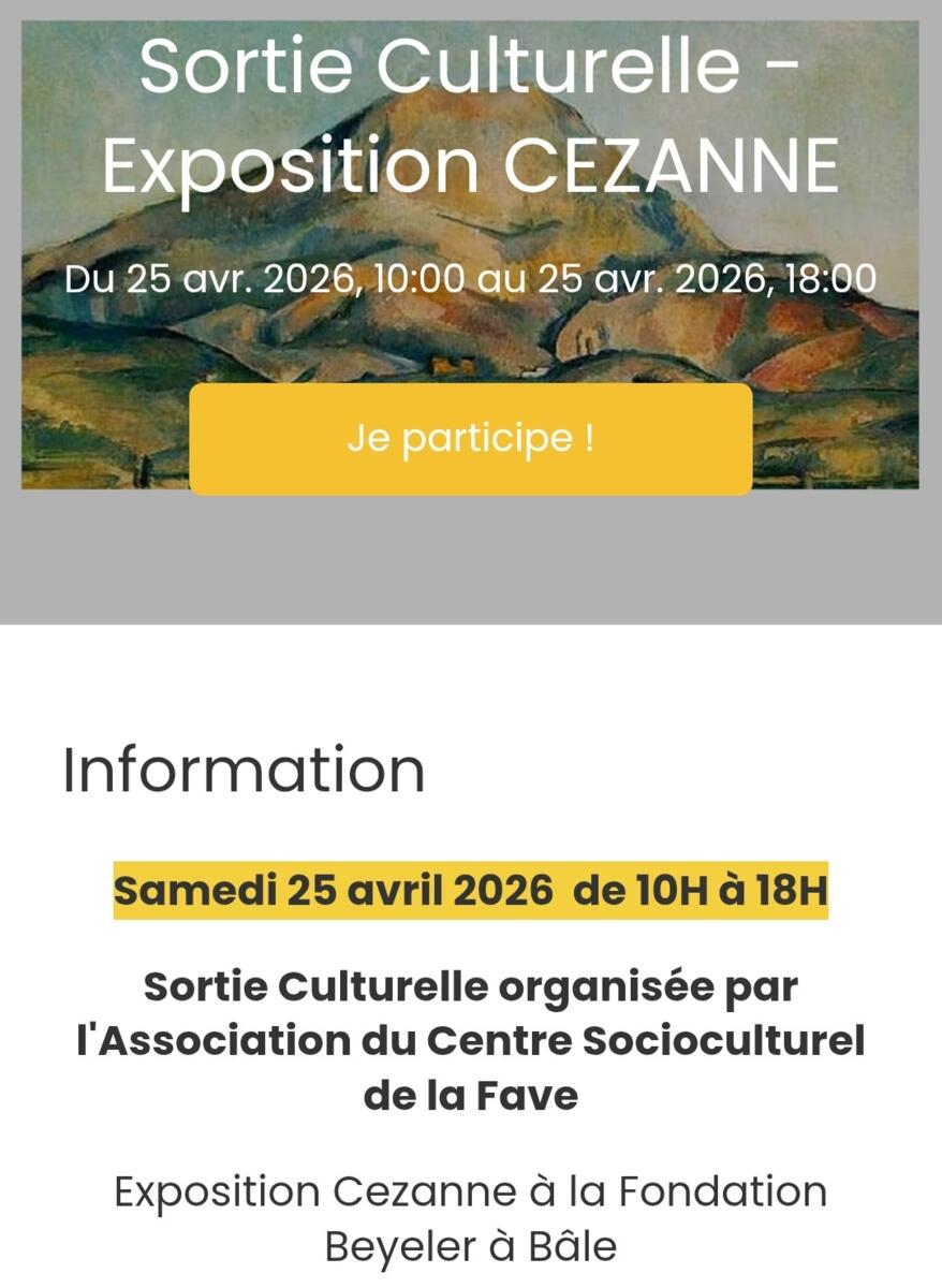L'Association du Centre SocioCulturel de la Fave vous propose une sortie culturelle en bus à la Fondation Beyeler à Bâle à l'occasion de l'exposition dédiée à Paul CEZANNE.