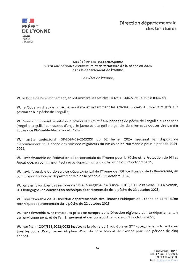 Veuillez trouver ci dessous l'arrêté relatif aux périodes d'ouvertures et de fermetures de pêche pour 2026