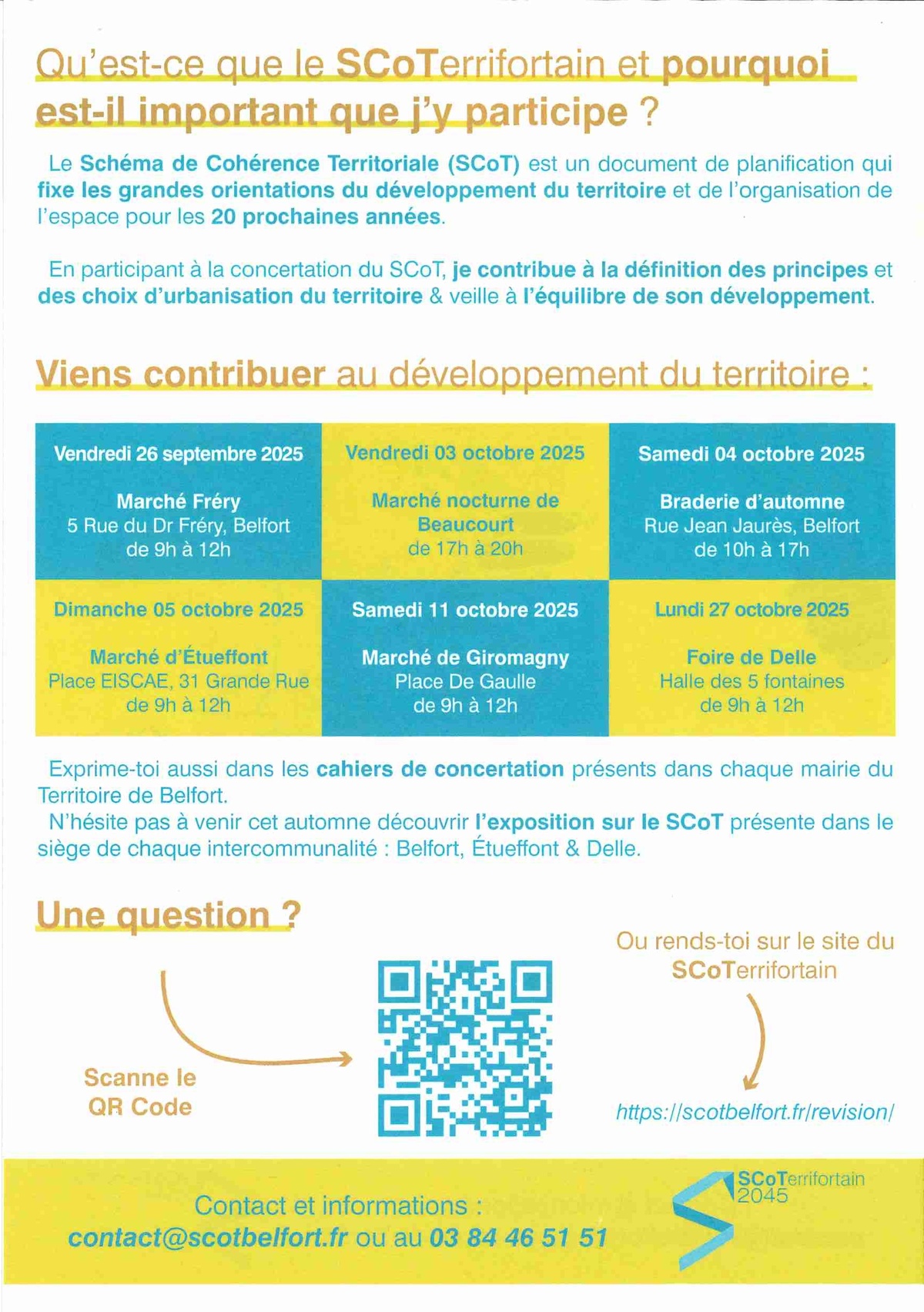 Dans le cadre de la révision du Schéma de Cohérence Territoriale (SCoT) du Territoire de Belfort, une démarche de concertation a été définie. Les modalités de concertation fixées dans la délibération du 29 mars 2023 relative à la procédure de révision du SCoT prendront plusieurs formes dont la mise à disposition d’un cahier de concertation dans chaque mairie du Territoire ainsi qu’aux sièges des intercommunalités et du syndicat mixte du SCoT.
