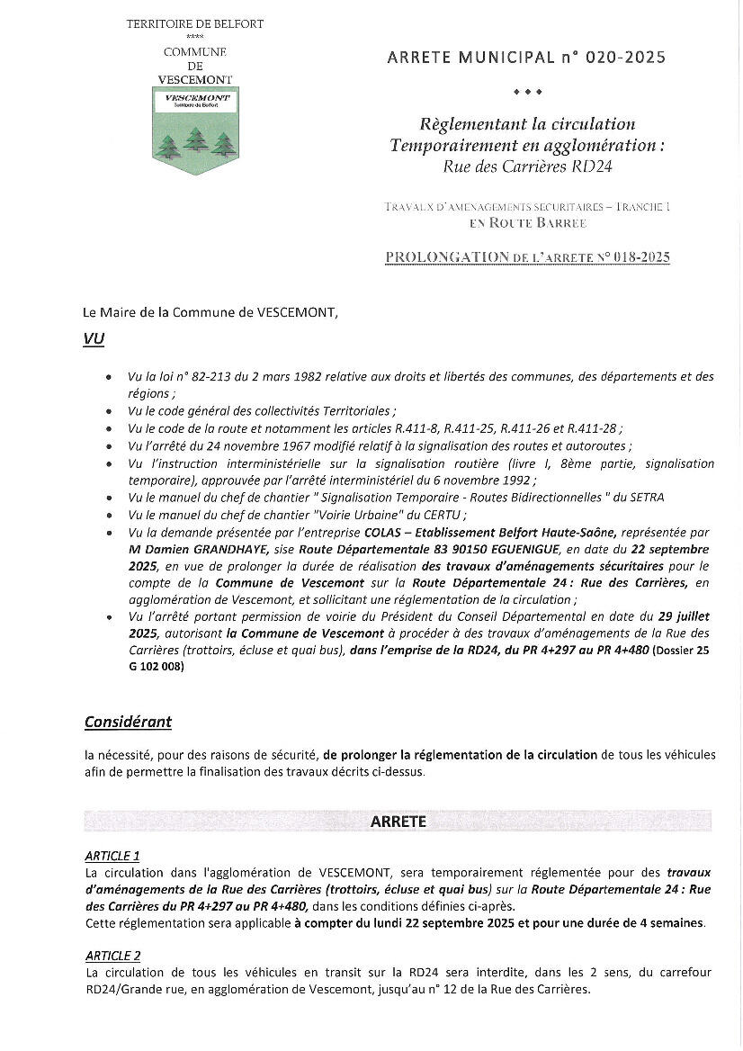 🚧 Les travaux de voirie dans la rue des Carrières à Vescemont sont prolongés