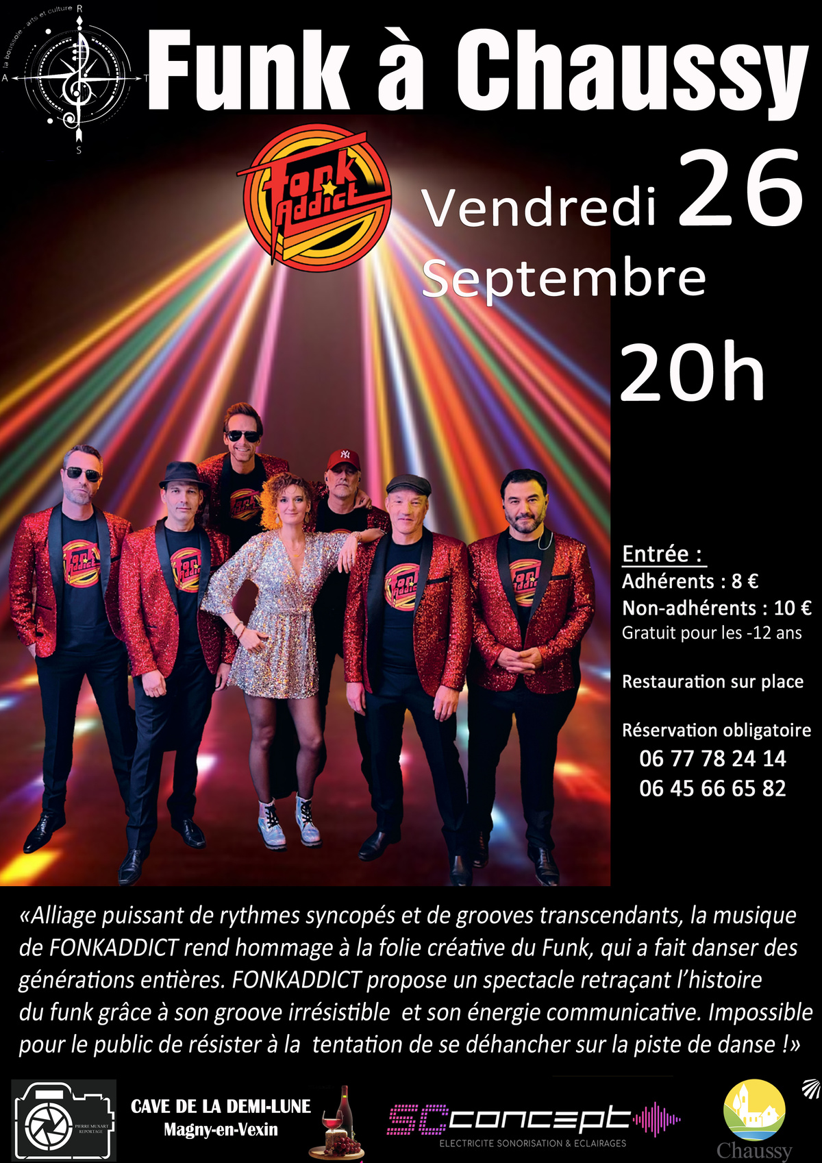 La Boussole vous propose un « Funk à Chaussy » avec le groupe Fonk Addict que nous avions déjà reçu en mars 2024 et qui avait fait carton plein ! Une occasion de (re)vivre un très bon moment musical et festif ! N’hésitez pas à réserver dès maintenant (SMS au 06 77 78 24 14 ou au 06 45 66 65 82)