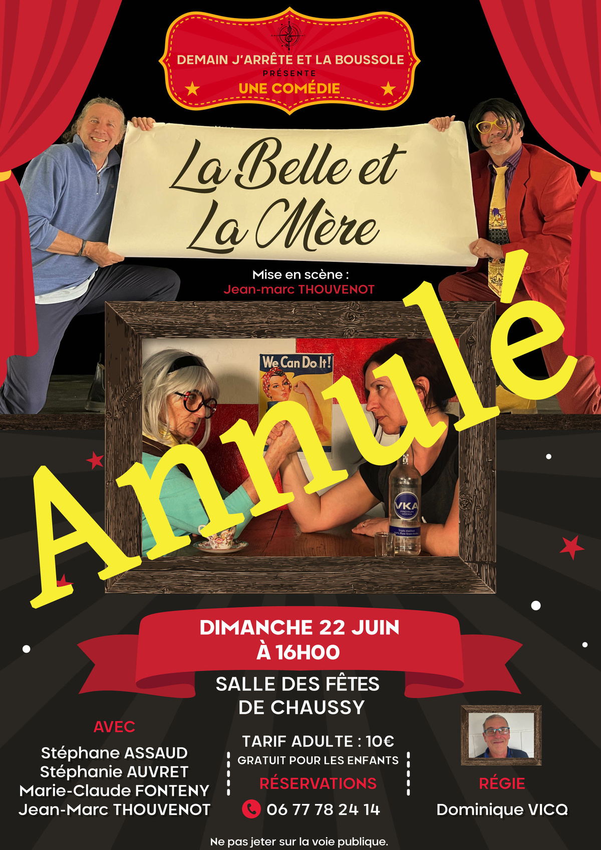 Décidément nous jouons de malchance avec la compagnie "Demain j'arrête" et la pièce de théâtre "La Belle et la Mère" ! Un des comédiens est empêché pour des raisons de santé ; raison pour laquelle vous n'avez pas revu de communication pour l'évènement (flyers, réseaux,...). Nous lui souhaitons bon rétablissement et ne désespérons pas que ce chouette évènement puisse avoir lieu ultérieurement à Chaussy.