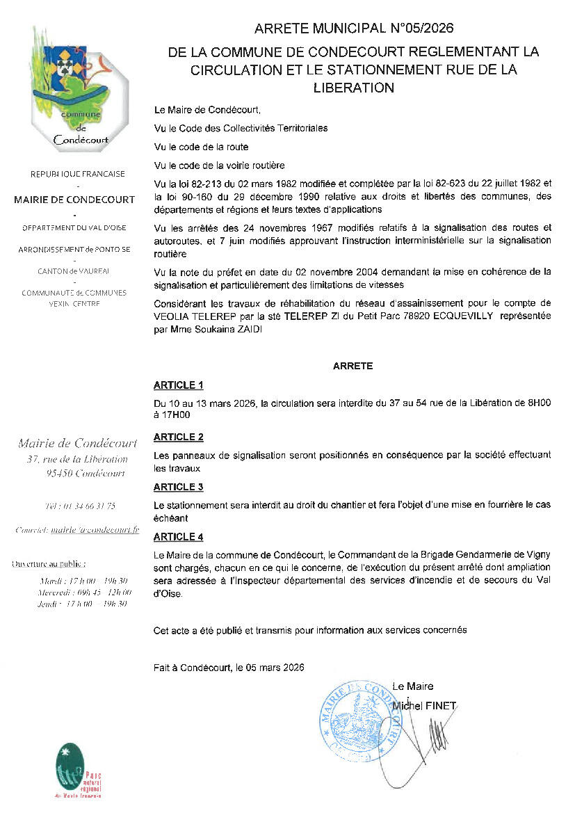 Arrêté Municipal De Restriction De Circulation 06/03/2026 En raison de travaux de réhabilitation du réseaux d'assainissement, la circulation sera interdite du 37 au 54 de la rue de la Libération du 10 au 13 mars 2026 de 8h à 17h.