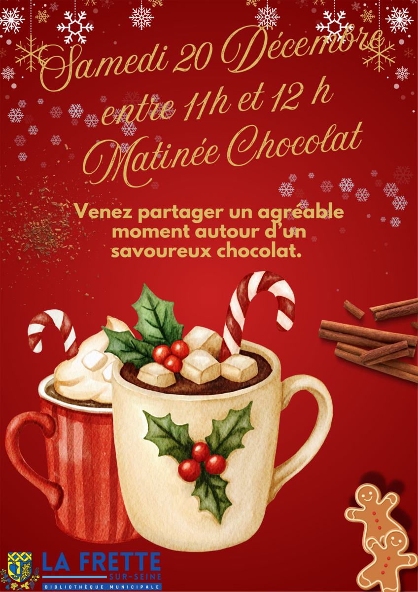 Matinée chocolat à la bibliothèque. 25-12-14 Matinée chocolat samedi 20 décembre à la bibliothèque. Ouvert à tous. Source : Mairie de La Frette-sur-Seine