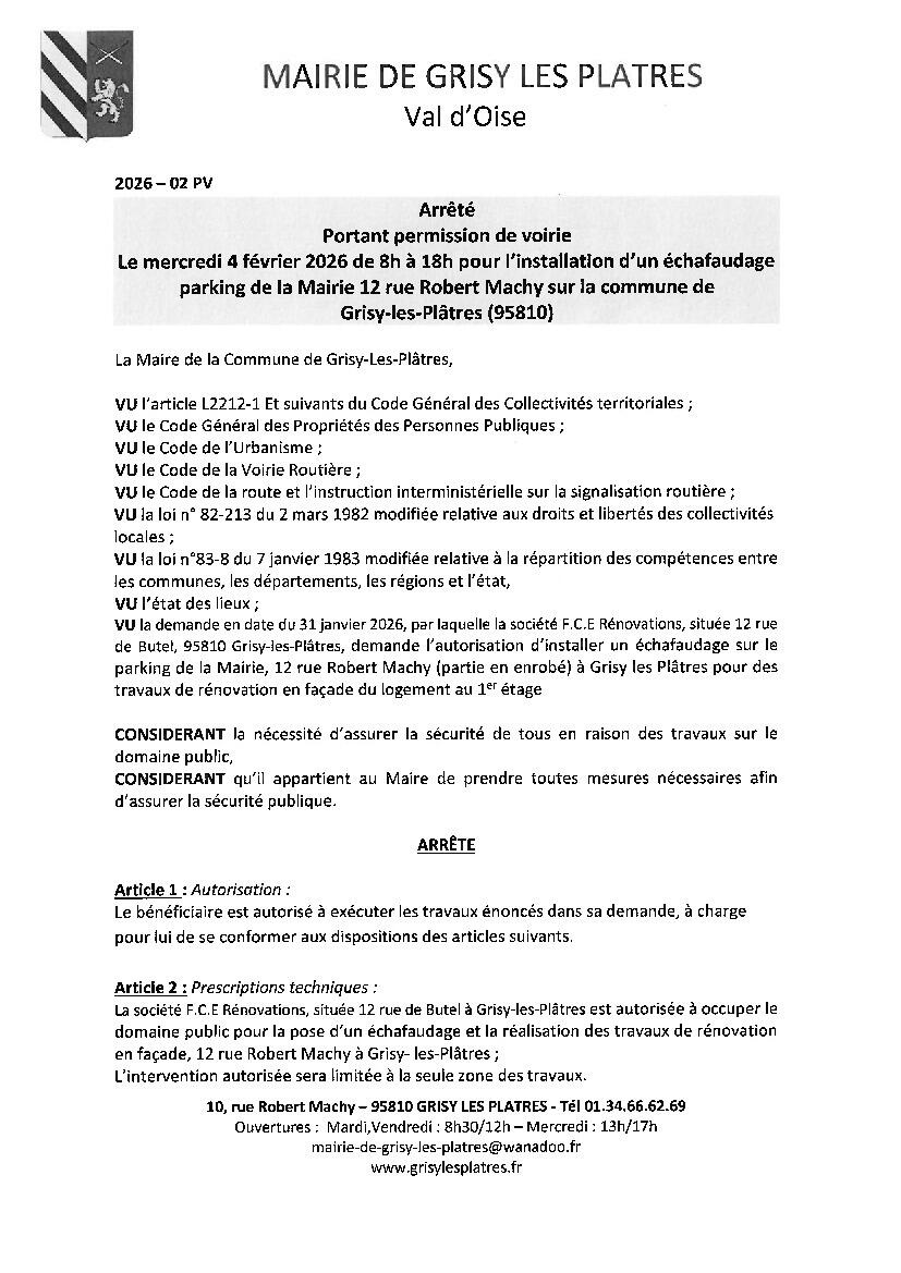 Arrêté de permission de voirie le 4 février de 8h à 18h