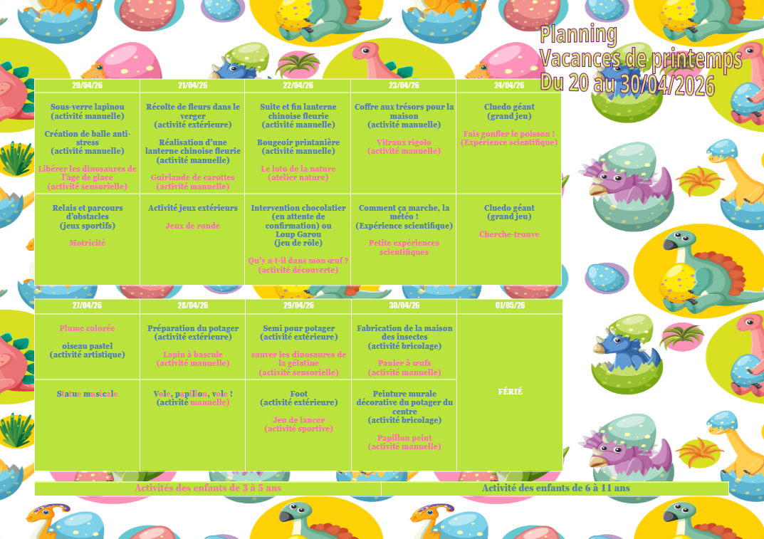 planning des activités des vacances de printemps