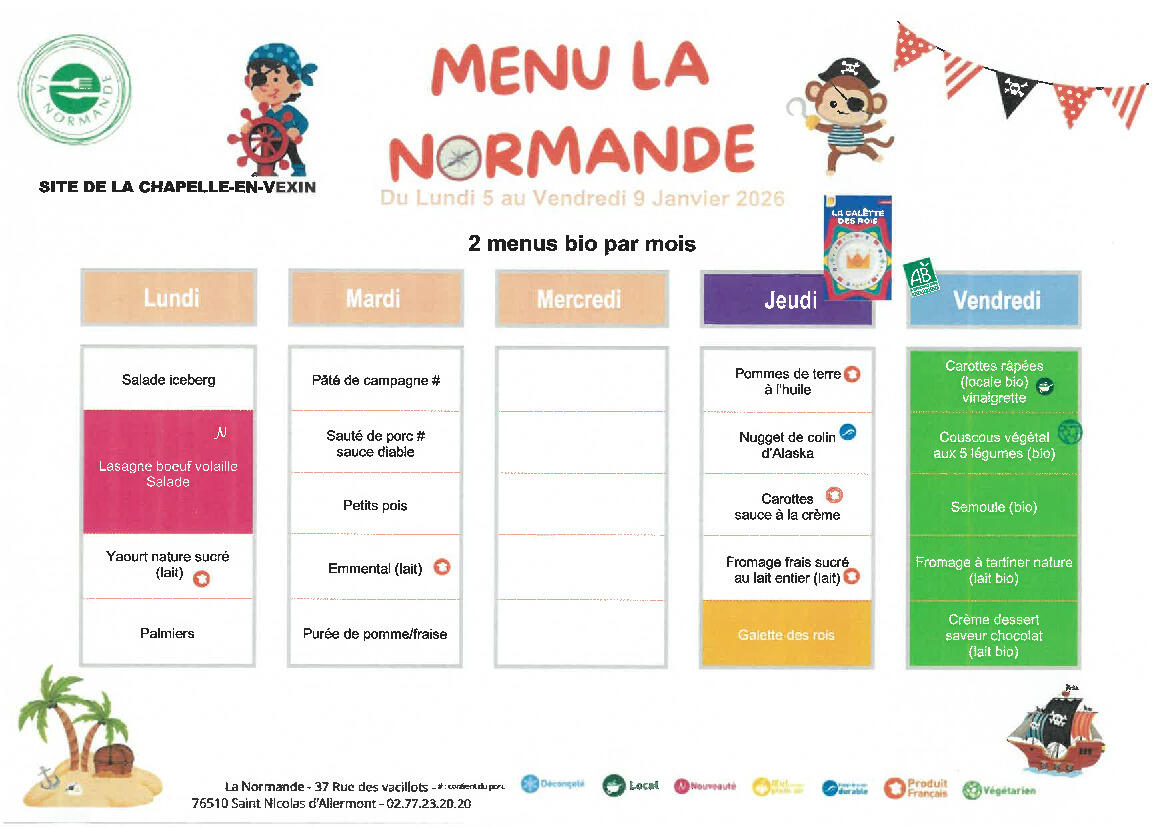 MENUS SIIS BUHY - LA CHAPELLE-EN-VEXIN ET MONTREUIL-SUR-EPTE 26-01-02 👩🍳du 5 au 9 janvier 2026 par site de restauration