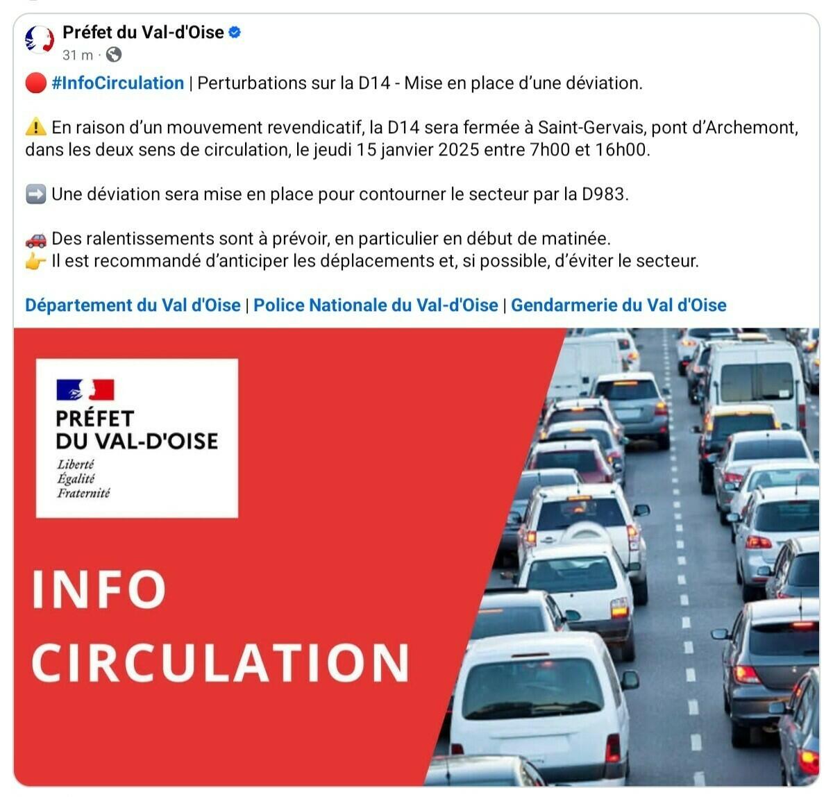 PREF 95 : Perturbations sur la D14 à prévoir le 15/1/26