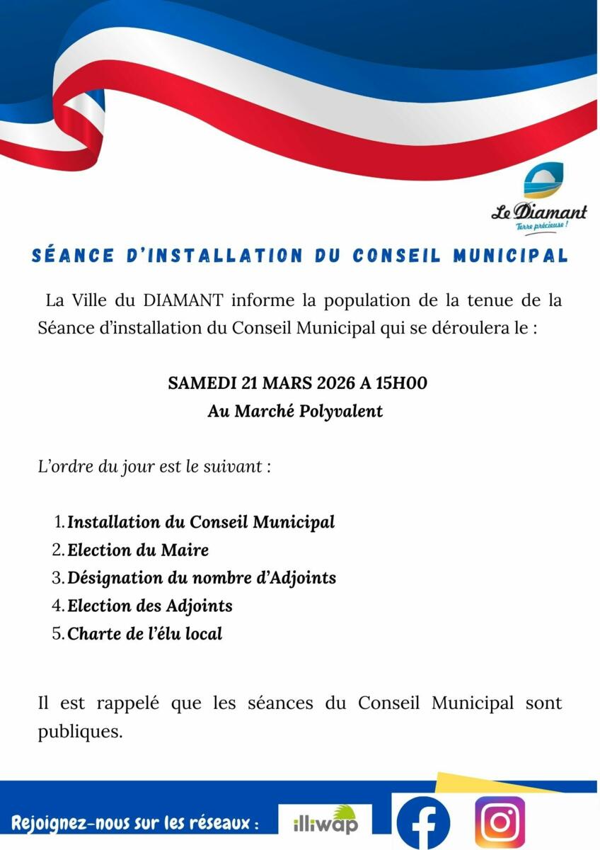 La Ville du DIAMANT a le plaisir de vous convier ร  assister ร  la sรฉance d'installation du Conseil Municipal qui se dรฉroulera le ย :ย