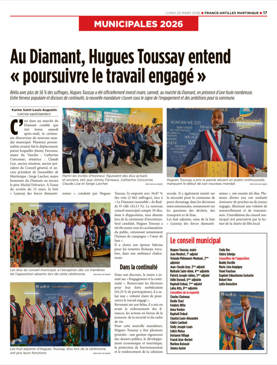๐Retrouvez dans l'รฉdition du lundi 23 mars 2026 du quotidien "France-Antilles", l'article relatant la sรฉance d'investiture du Conseil Municipal du Diamant qui s'est dรฉroulรฉe le samedi 21 mars 2026 au marchรฉ polyvalent de Dizac.