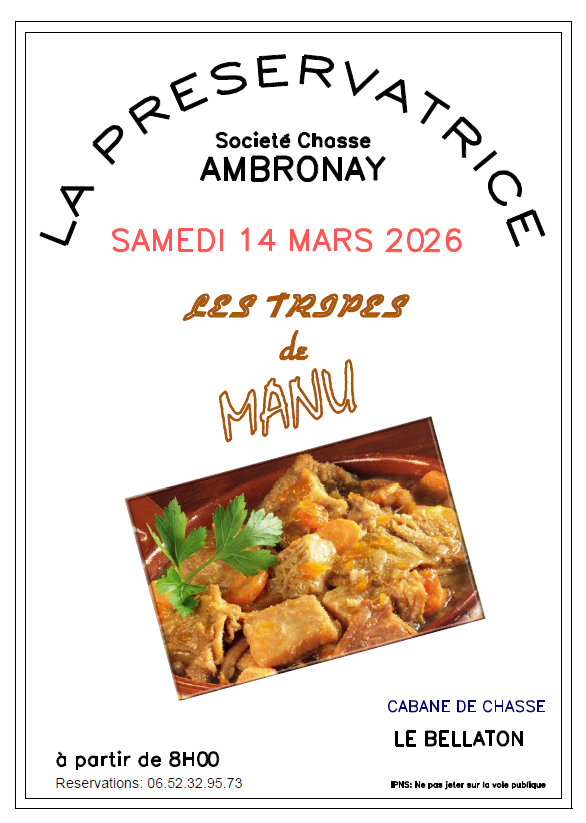 Vente De Tripes - 14 Mars 2026 06/03/2026 La société de chasse "La Préservatrice" organise une vente de tripes, le samedi 14 mars 2026, à partir de 8h à la cabane de chasse du Bellaton Réservations : 06.52.32.95.73