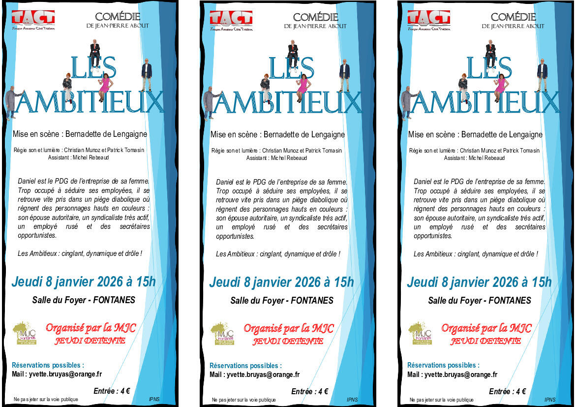 MJC - Jeudi détente 26-01-03 Dans le cadre des "Jeudi Détente", une pièce de théâtre vous est proposée le jeudi 8 janvier à 15h au Foyer.