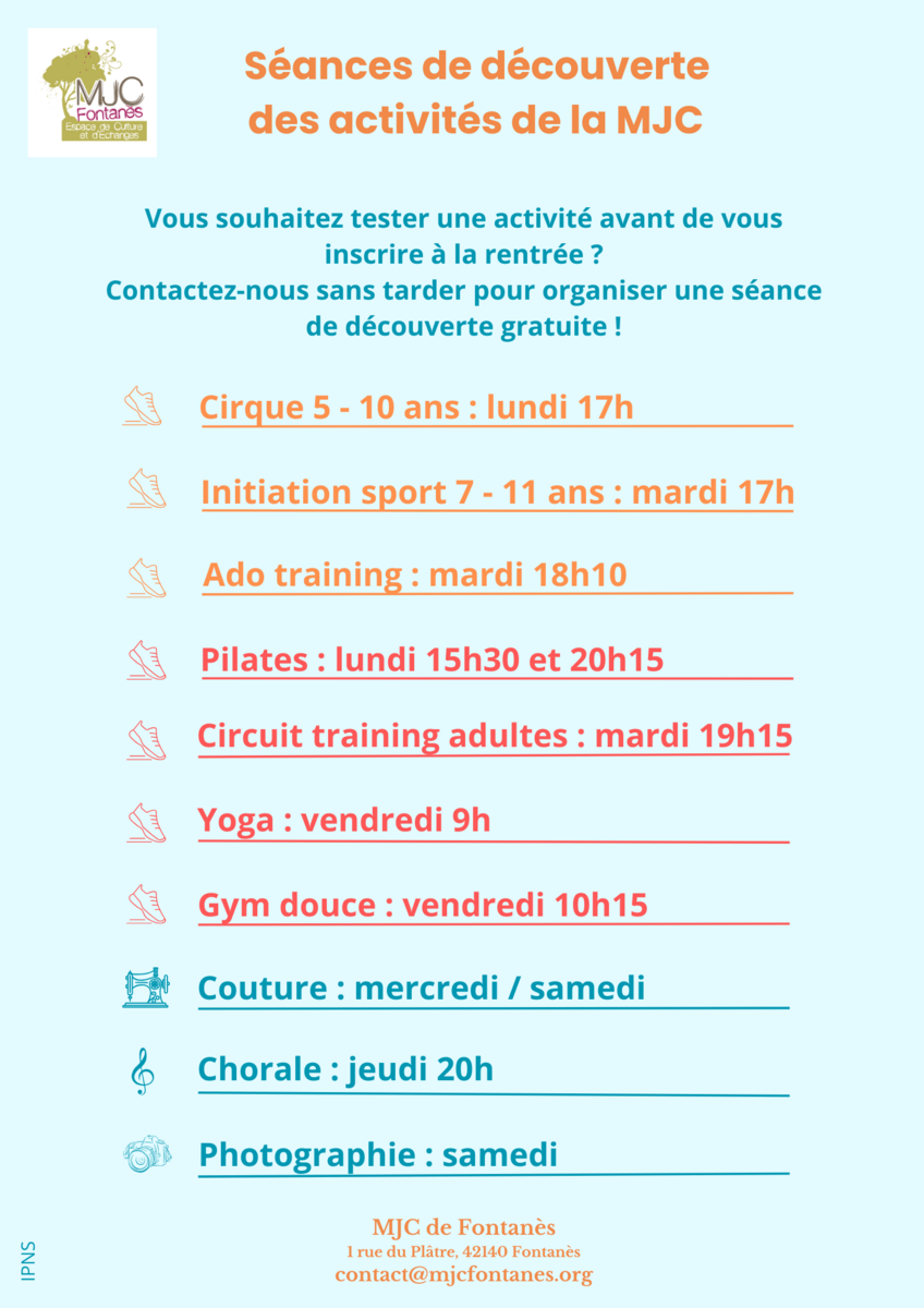 Vous souhaitez tester une activité avant de vous y inscrire à la rentrée prochaine ? Envoyez un mail sans tarder à contact@mjcfontanes.org afin d'organiser une séance d'essai gratuite.