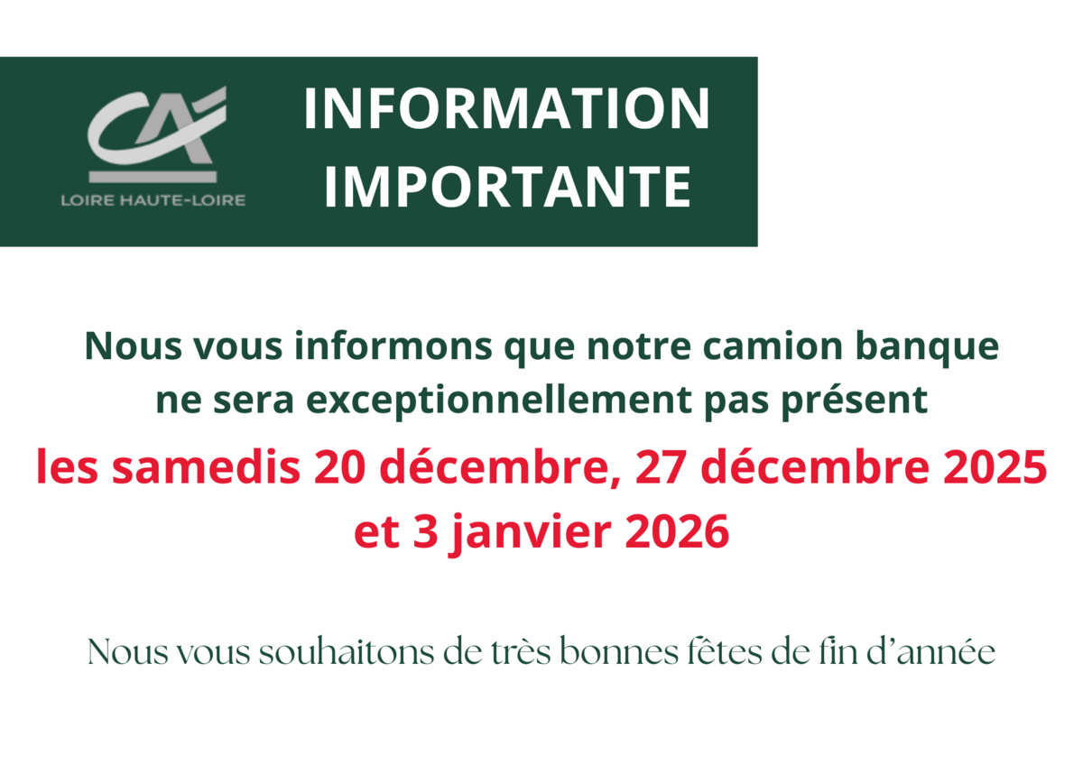 En raison des Fêtes de fin d'année, le camion banque du Crédit Agricole ne sera pas présent à Lentigny les samedis 27 décembre 2025 et 3 janvier 2026.