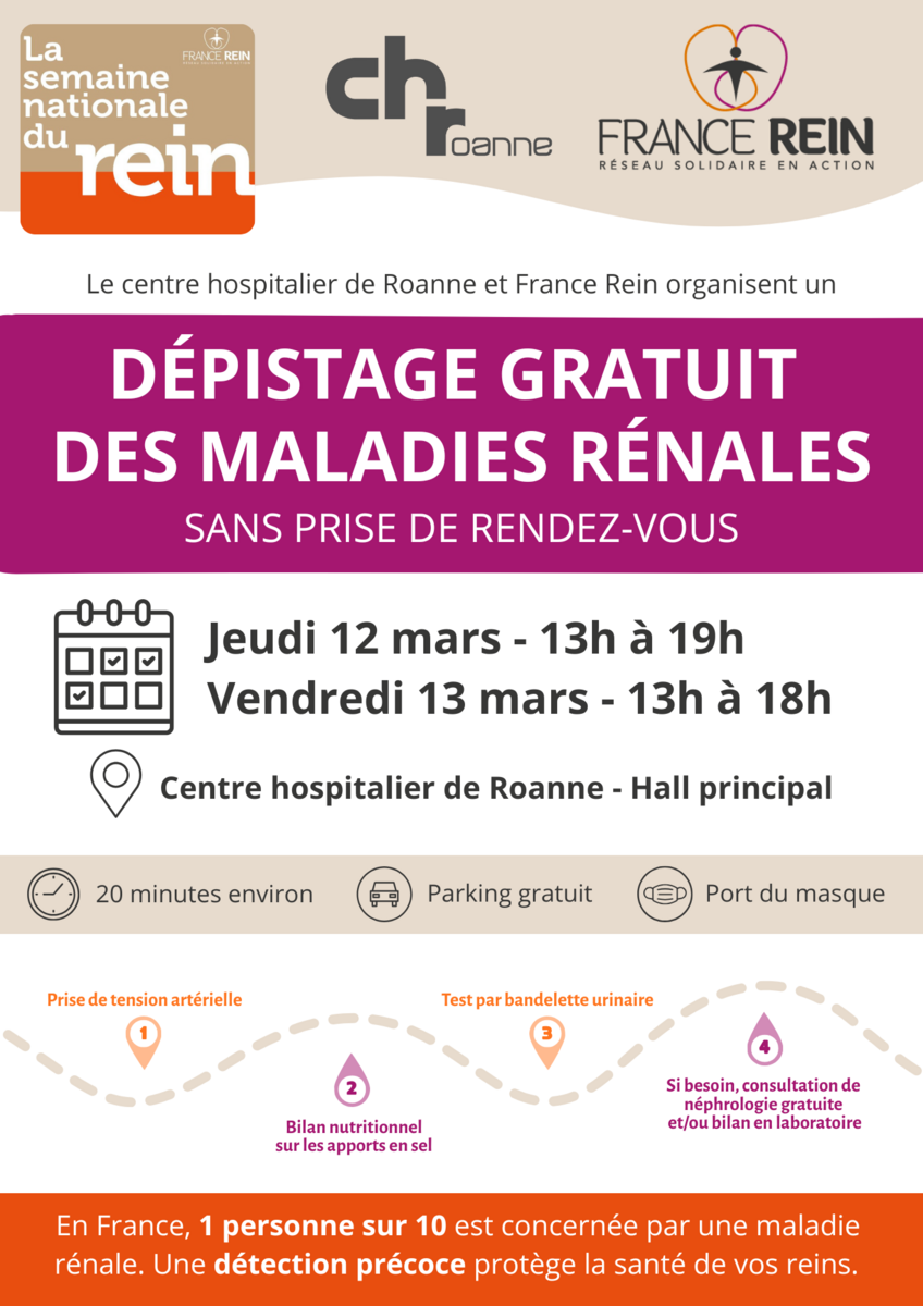 ℹ À l'occasion de la semaine nationale du rein et en partenariat avec l’association France Rein, le Centre hospitalier de Roanne organise deux demi-journées de dépistage gratuit des maladies rénales.