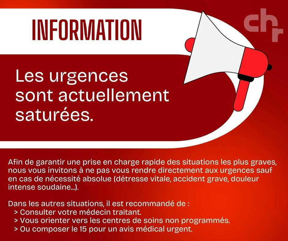 Afin de garantir une prise en charge rapide des situations les plus graves, nous vous invitons à ne pas vous rendre directement aux urgences sauf en cas de nécessité absolue (détresse vitale, accident grave, douleur intense soudaine, etc.).
