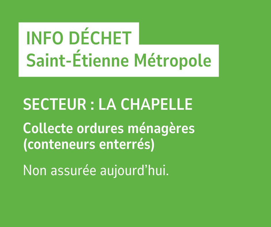 Nous vous informons que, suite à un problème technique sur le camion-grue du prestataire de Saint-Etienne Métropole, la collecte des ordures ménagères (conteneurs enterrés) ne pourra pas être assurée aujourd’hui sur le secteur de La Chapelle.