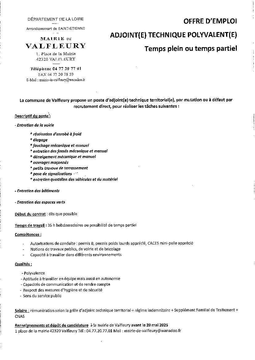 Offre d'emploi d'Agent technique polyvalent 25-03-25 La commune de Valfleury recherche un/une Agent technique polyvalent.