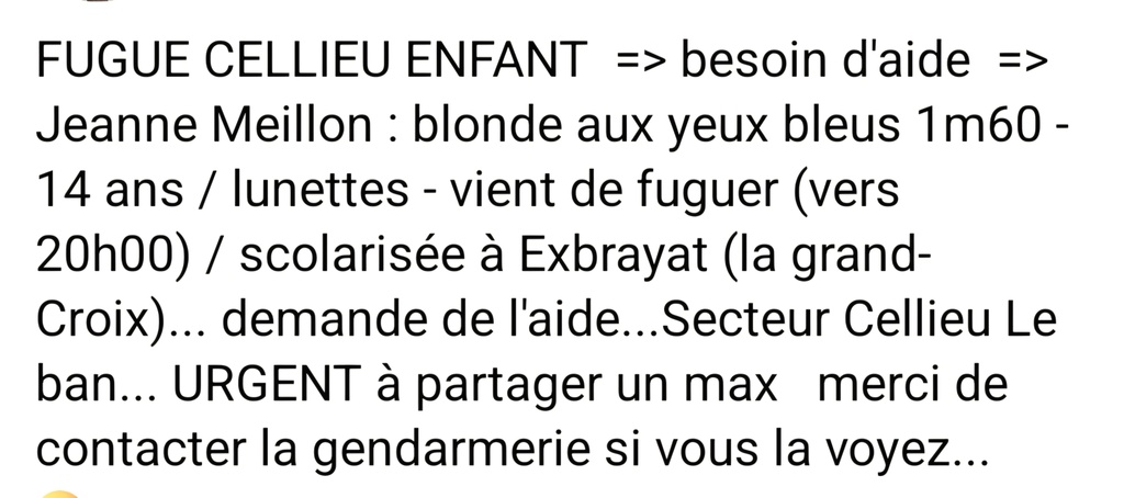 Fugue adolescente 14 ans secteur Le Ban Cellieu