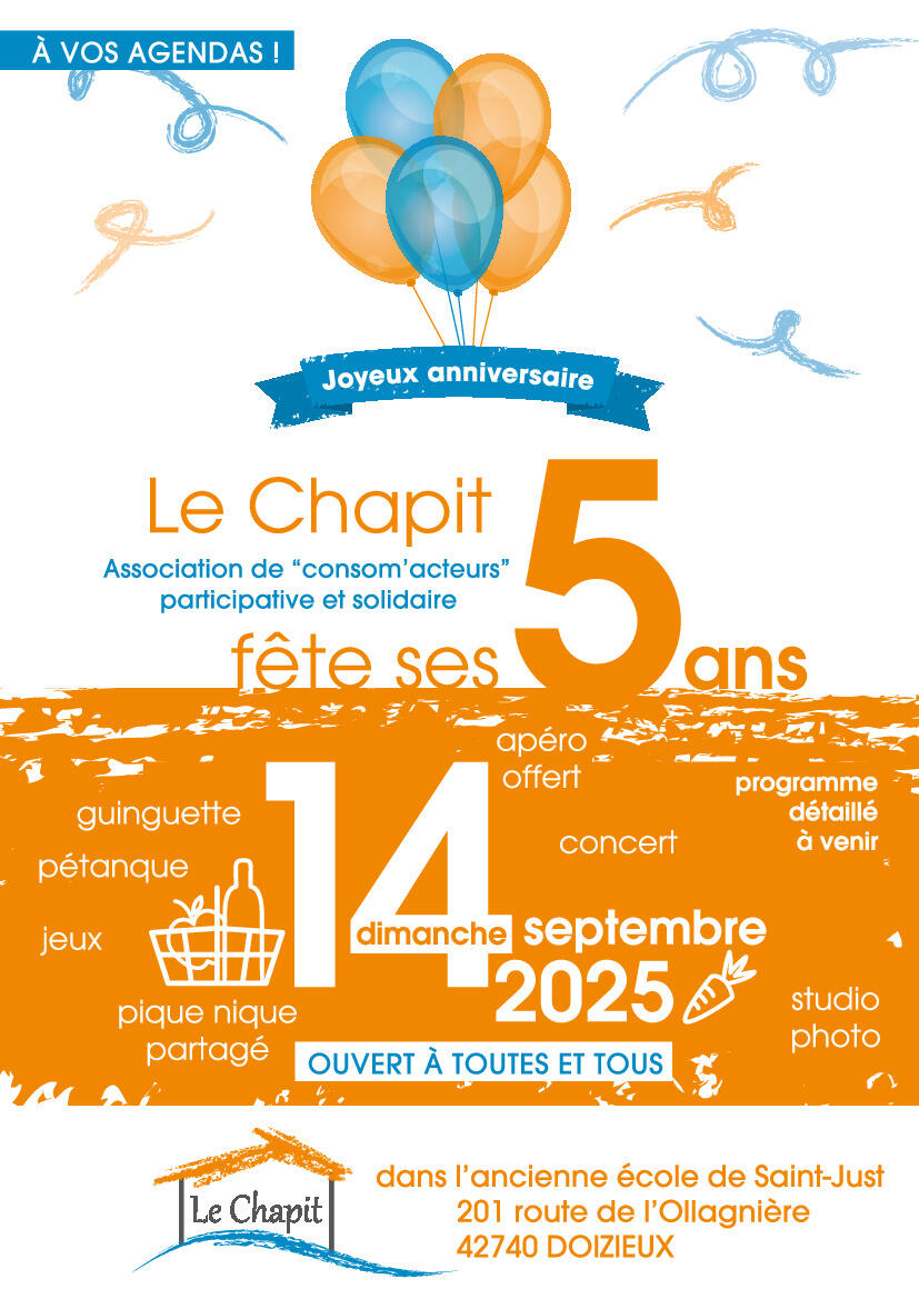 Le Chapit fête ses 5 ans et nous serions ravi·es de vous compter parmi nous pour célébrer ensemble cette belle aventure participative et solidaire !