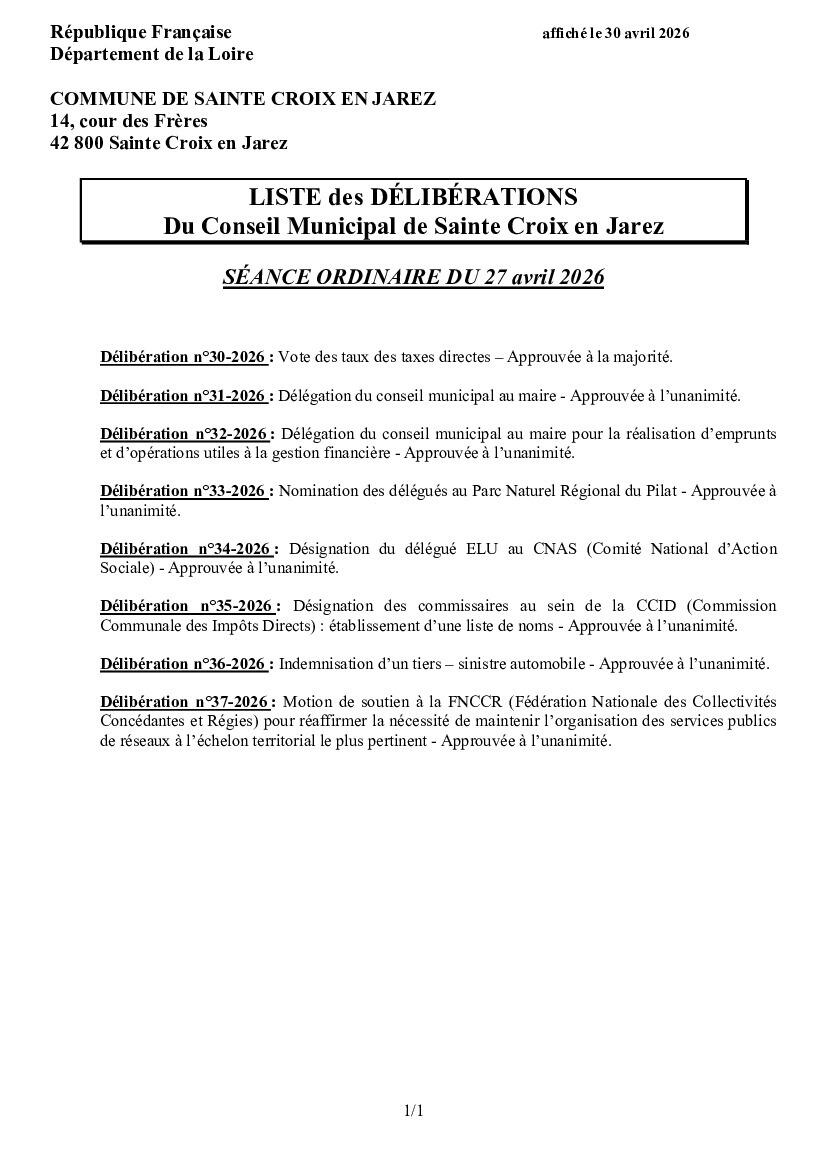 Liste des délibérations Conseil Municipal du 27 avril 2026