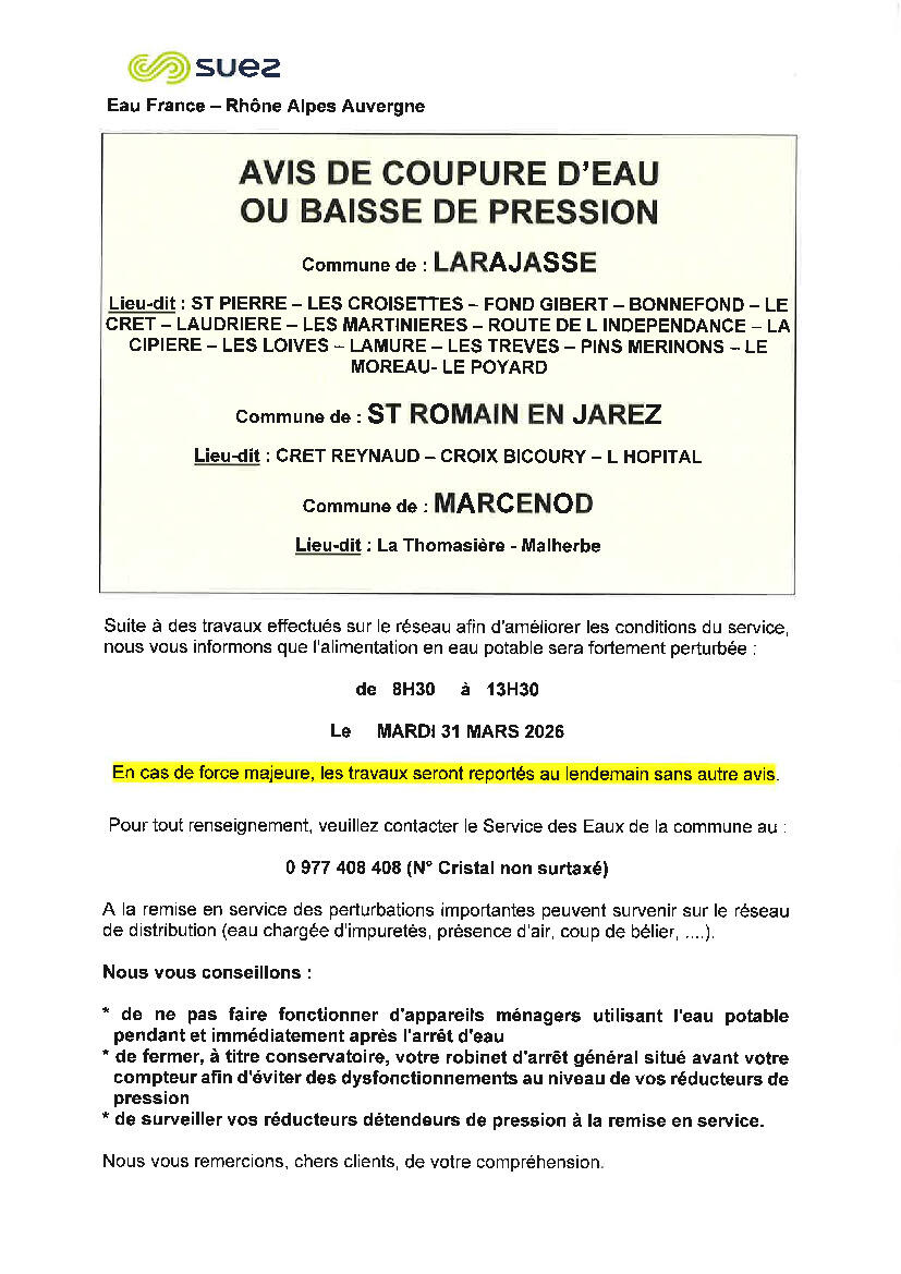 Votre mairie / Actualités / SUEZ - COUPURE EAU