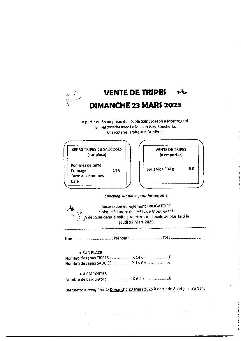 L'APEL de Montregard organise une matinée tripes à partir de 08H00 au préau de l'école le dimanche 23 mars.