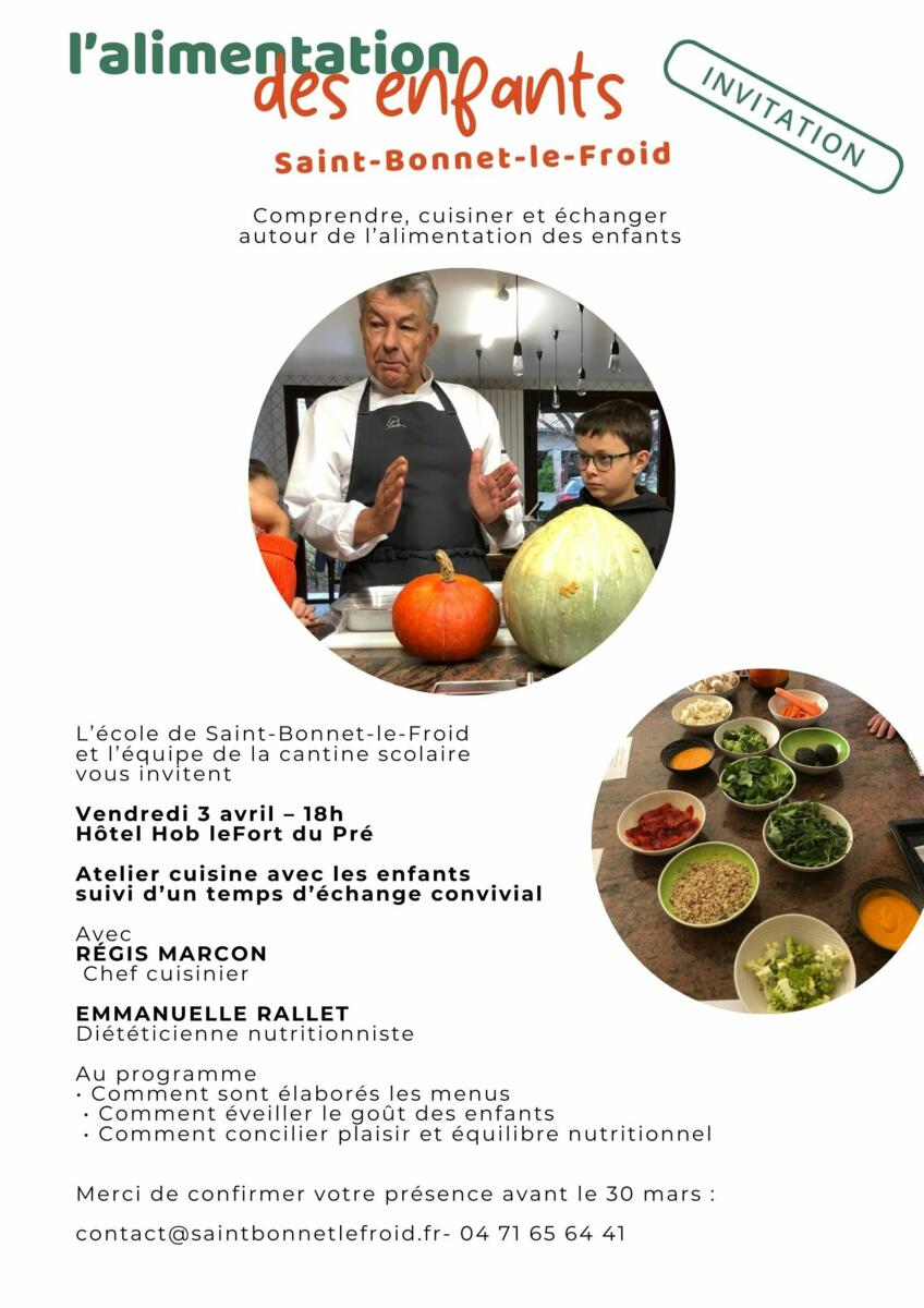 Conférence alimentation 26-03-23 L'équipe de l'école du village gourmand à Saint-Bonnet-le-Froid organise un événement autour de l'alimentation des enfants.