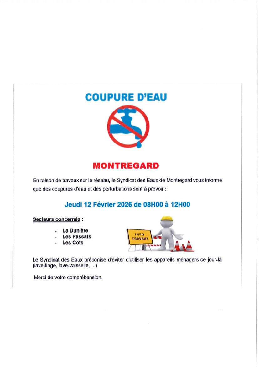 Une coupure d'eau est prévue le jeudi 12 février 2026de 8h00 à 12h00.