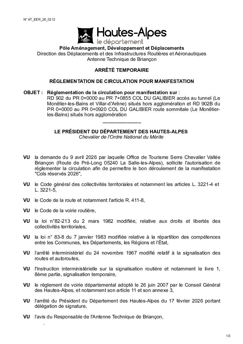 Le Conseil Départemental des Hautes-Alpes vous informe que la route d'accès au Galibier (côté Hautes Alpes) connaîtra des perturbations de circulation, les 29/06/2026, 16/07/2026 et 04/08/2026. La circulation interdite sur la route d'accès au tunnel de 9h00 à 12h00 les jours indiqués.