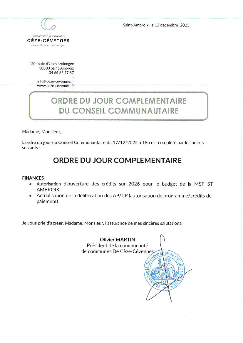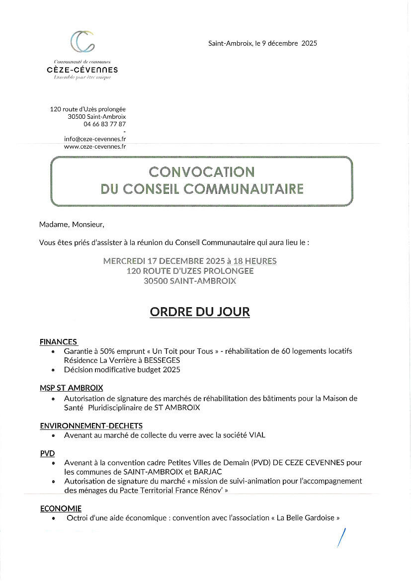 Mercredi 17 décembre 2025 à 18h à la communauté de communes De Cèze Cévennes, 120 route d'Uzès prolongée à Saint-Ambroix.