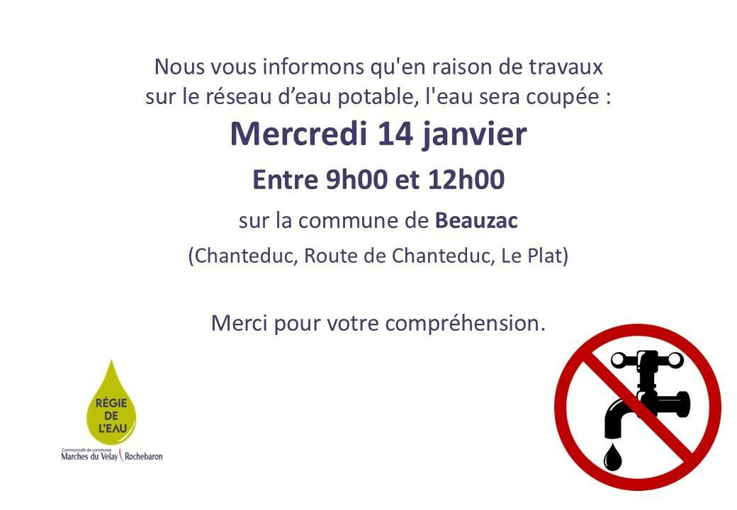Nous vous informons qu'en raison de travaux sur le réseau d'eau potable, une coupure d'eau aura lieu :