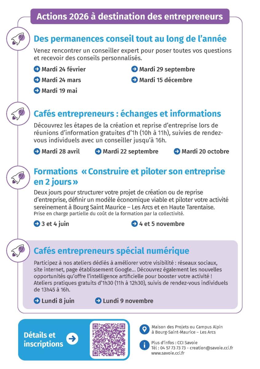 💡La CCI Savoie et ses partenaires (France Travail, banques partenaires, etc.) proposent, tout au long de l’année 2026, un accompagnement de proximité aux entrepreneurs du territoire à la Maison des Projets et au Campus Alpin Bourg Saint Maurice.