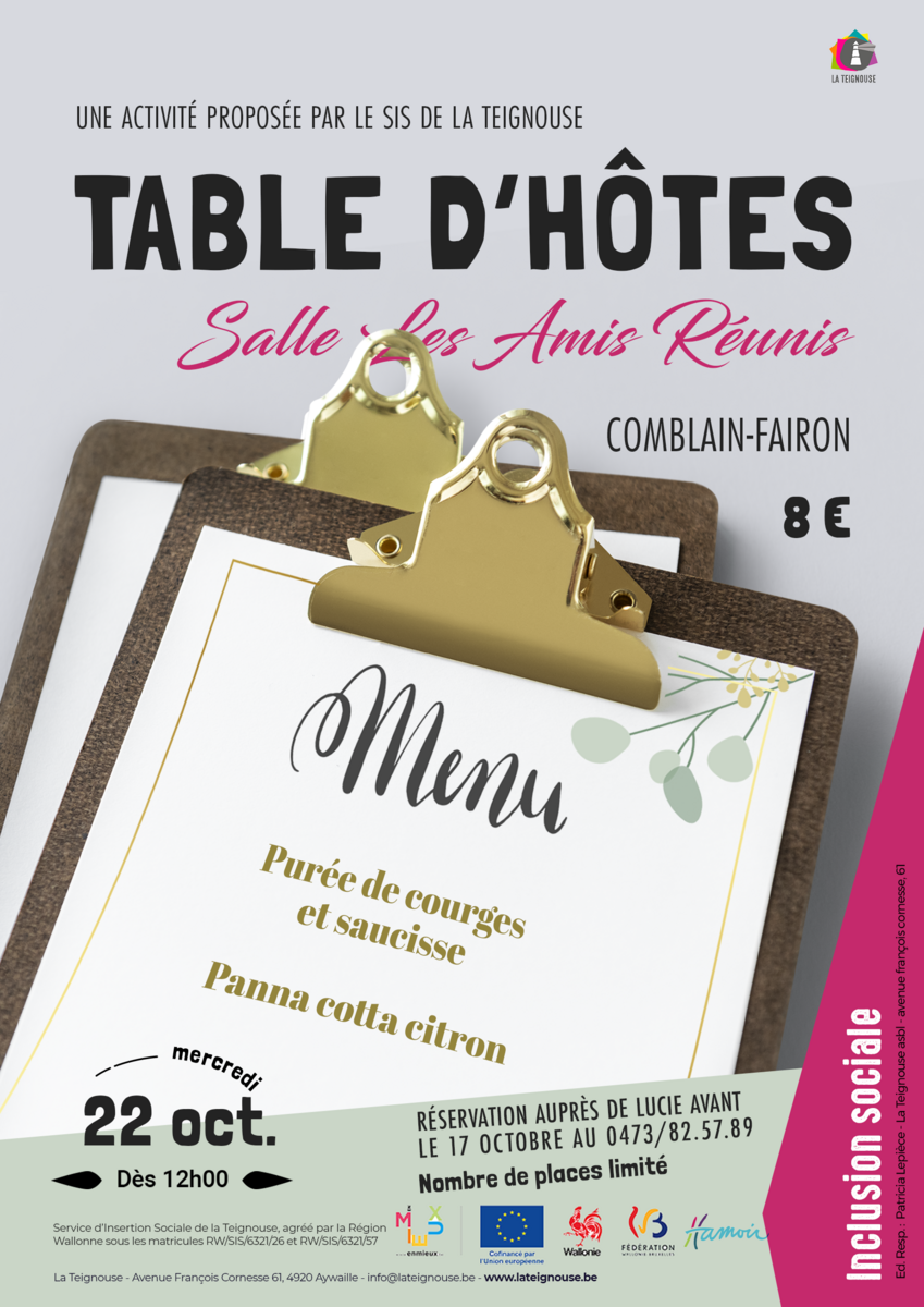 Retour de la table d'hôtes de la Teignouse le mercredi 22 octobre à 12 h à la salle les Amis réunis à Fairon.