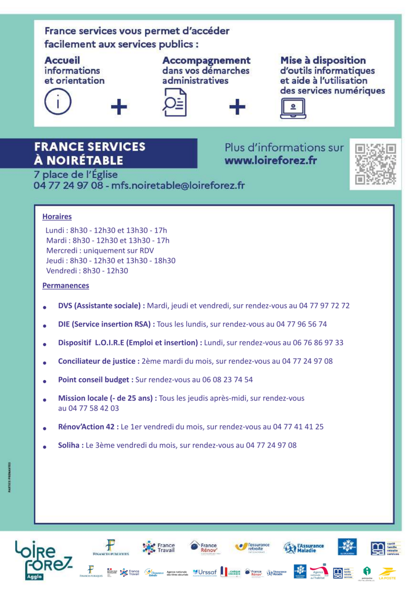 Consultez le détails des permanences accueillies au sein de France Services Noirétable.