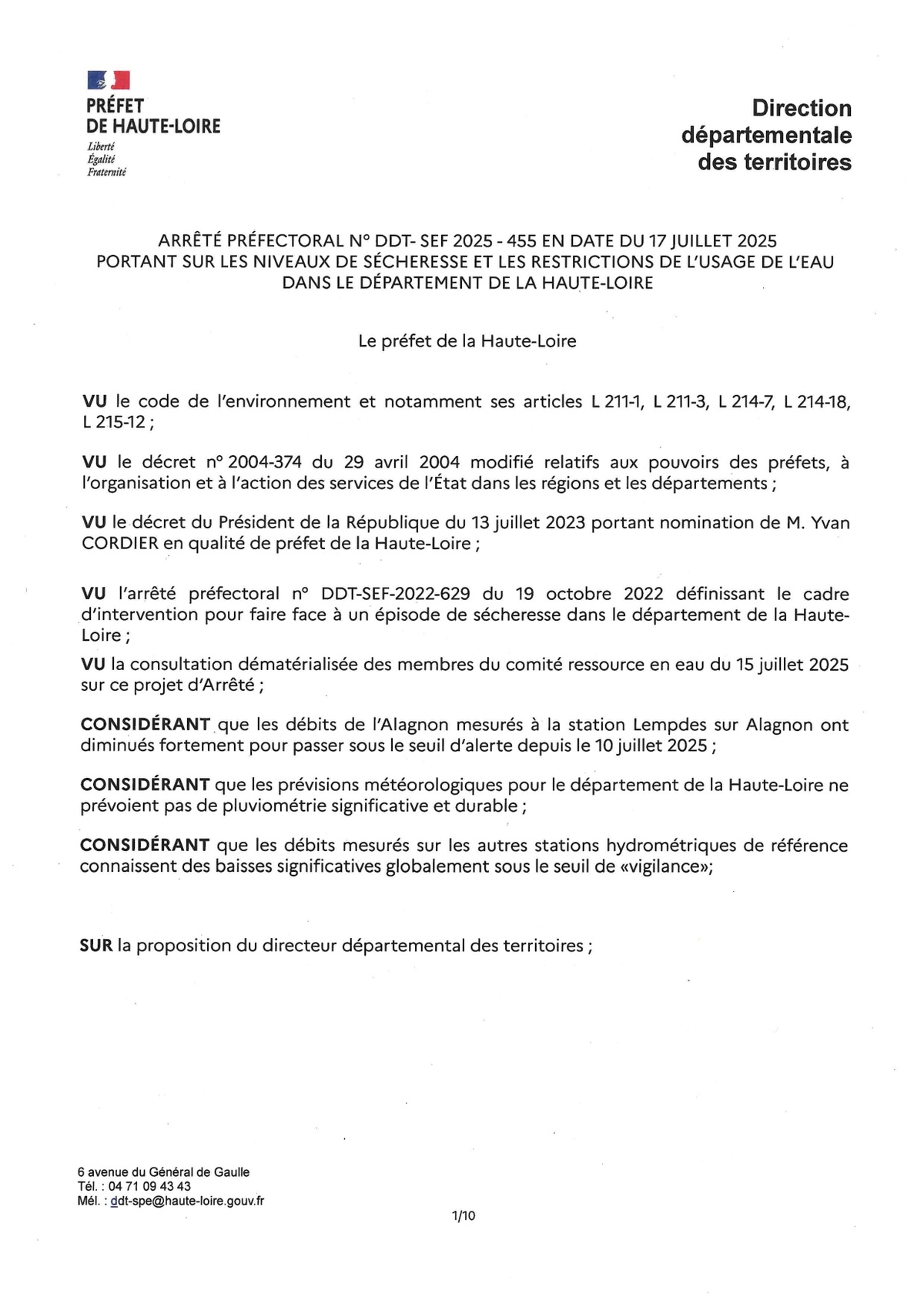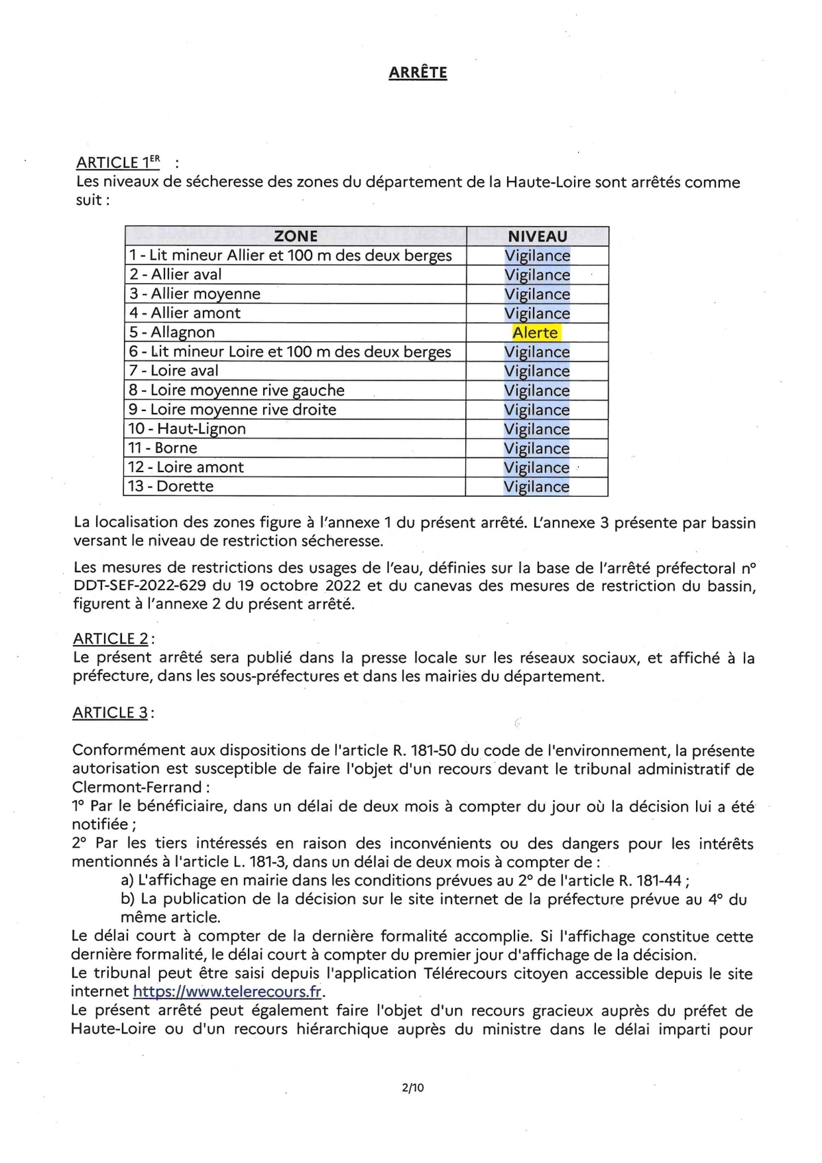Monsieur le Préfet de Haute Loire a arrêté comme suit :