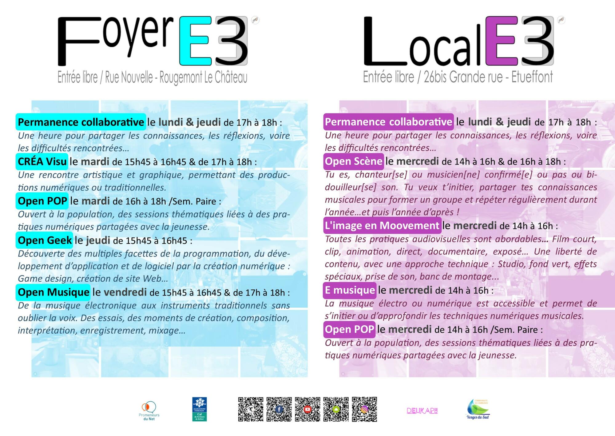 Open E3 c'est quoi ? Un réseau, des espaces de créativité collaboratifs pour la jeunesse, ouverts à la population… 2 tiers lieux sur le territoire : - Foyer E3 à Rougemont-le-Château, - Local E3 à Etueffont. + 1 association Nos tiers lieux sont des espaces de grande ECOUTE, laboratoires de réflexion via la jeunesse… Sur ce qui fonctionne ou ne va pas, sur ce que l’on arrive à faire et à ne pas faire. Des terrains propices à trouver les solutions ensemble ! C’est apprendre par l’expérience, soi-même, avec les autres par l’ECHANGE de savoirs, des connaissances de chacun. Et surtout ENTREPRENDRE localement… Faisons le nous-même ! En agissant autrement quand il n’y pas d’alternative. C’est développer l’autonomisation par le projet, la création d’association et pourquoi pas l’émergence d’entreprise innovante.
