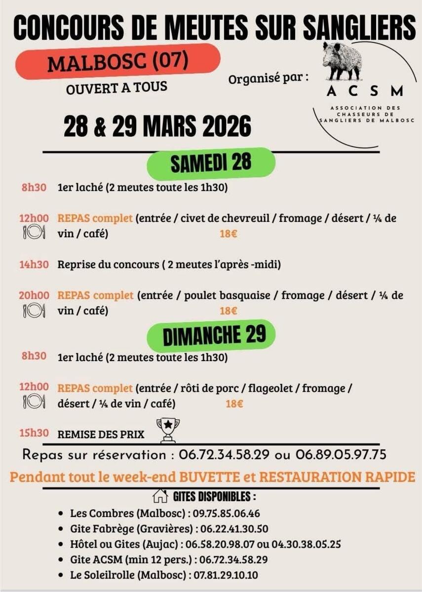 Samedi 28 et dimanche 29 mars : concours de meutes sur sangliers organisé par l'ACSM - Association de Chasse de Sangliers de Malbosc.