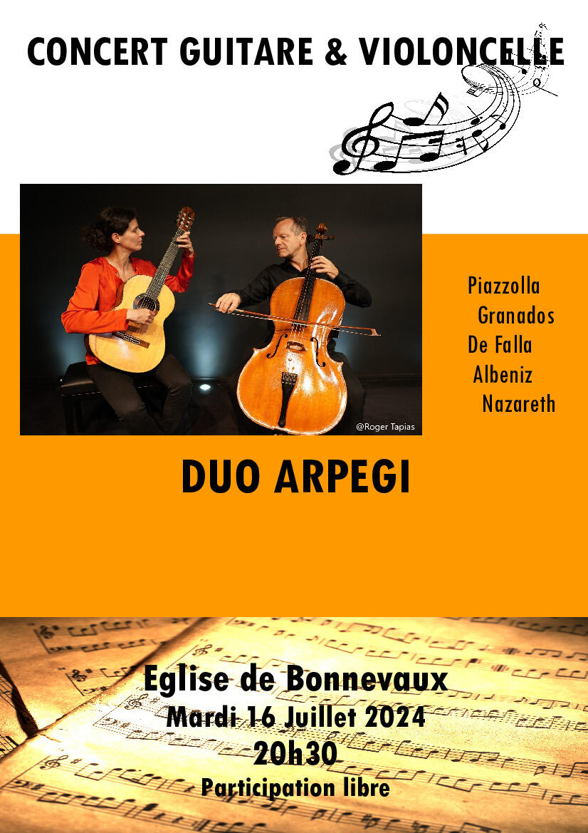 Le Comité des Fêtes de Bonnevaux a le plaisir de vous convier à son premier concert de l’été 2024, le mardi 16 juillet à 20 h 30, à l’église. (Participation libre) par le Duo Arpegi