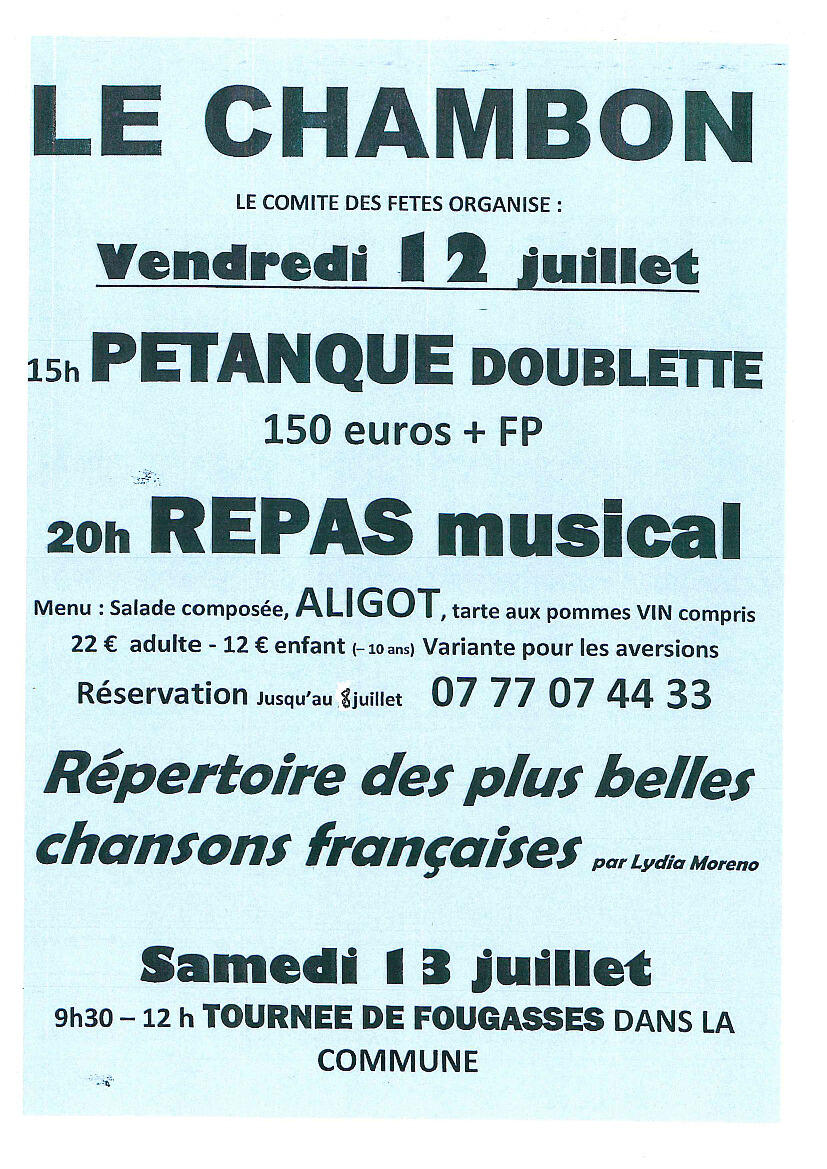 Comité des fêtes du Chambon 6/19/24 Le comité des fêtes organise sa journée festive le vendredi 12 juillet. Inscriptions jusqu'au 8 juillet.