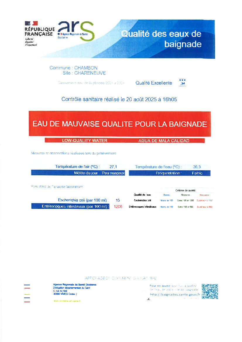 Après des contrôles effectués par l'Agence Régionale de Santé, les sites du "Pont du VILDOU" et de "CHARRENEUVE" sont totalement interdit à la baignade jusqu'à nouvel ordre.