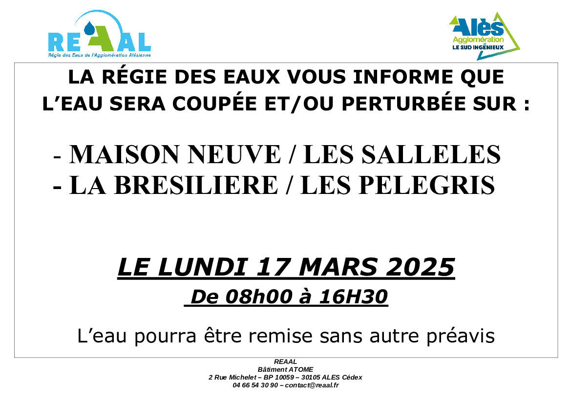 LA RÉGIE DES EAUX VOUS INFORME QUE L’EAU SERA COUPÉE ET/OU PERTURBÉE SUR :