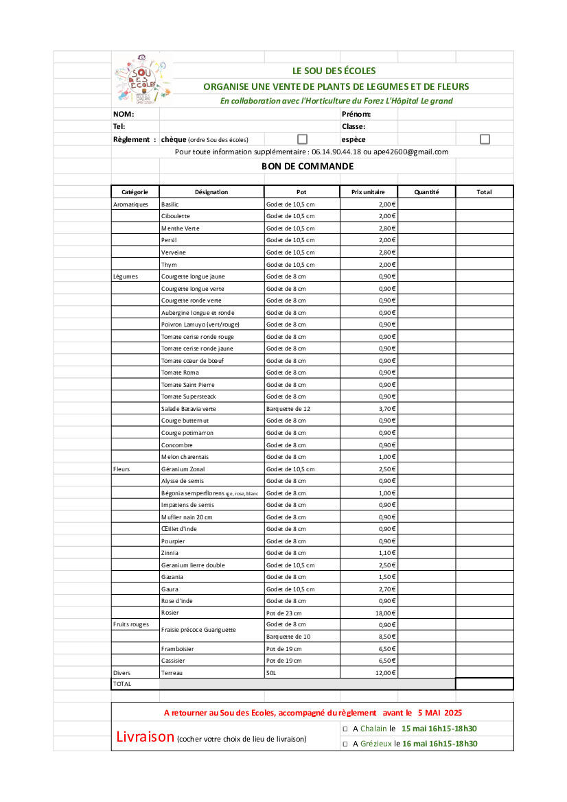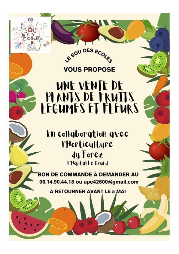 Le sou des écoles vous propose une vente de plants de fruits, légumes et fleurs en collaboration avec l'horticulture du Forez à l’hôpital le grand