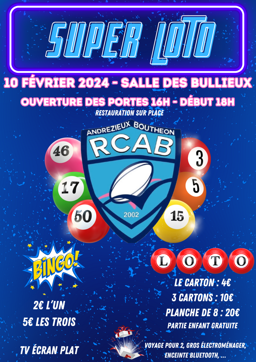 Le ๐Ÿ๐ŸŽ ๐Ÿรฉ๐ฏ๐ซ๐ข๐ž๐ซ ๐Ÿ๐ŸŽ๐Ÿ๐Ÿ’ ร  ๐ฅ๐š ๐ฌ๐š๐ฅ๐ฅ๐ž ๐๐ž๐ฌ ๐๐ฎ๐ฅ๐ฅ๐ข๐ž๐ฎ๐ฑ, se dรฉroulera le fameux Super Loto et Bingo du Rugby Club Andrรฉzieux-Bouthรฉonย