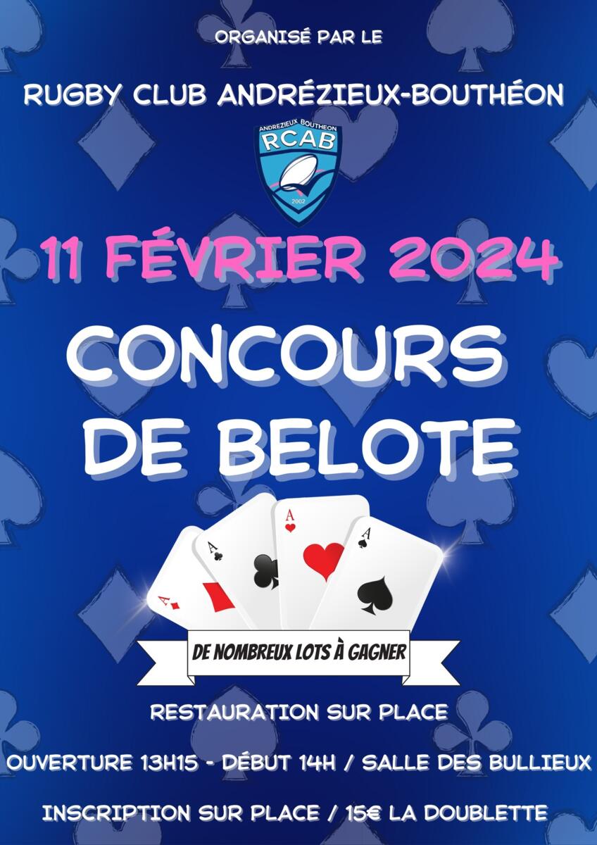 Dimanche 11 fรฉvrier 2024 se dรฉroule le concours de belote du Rugby Club Andrรฉzieux-Bouthรฉon ร  la salle des Bullieuxย ๐Ÿ˜€