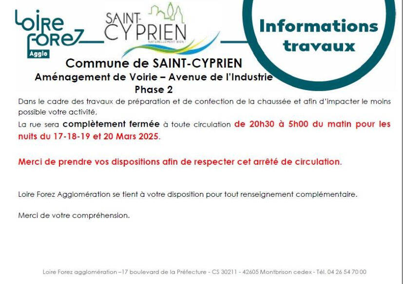 Rue barrée de 20h30 à 5h00 pour les nuits des 17 - 18 - 19 et 20 mars 2025.