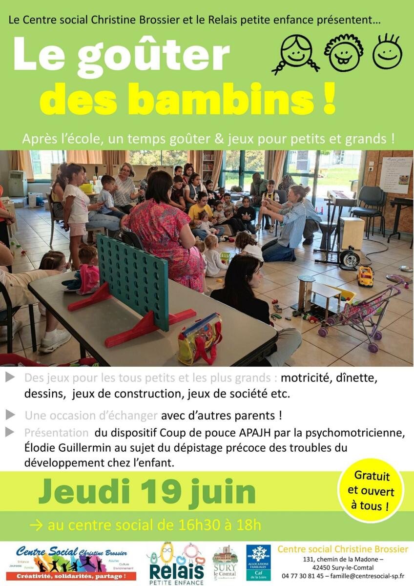Le jeudi 19 juin, de 16h30 à 18h, au Centre Social Christine Brossier, aura lieu le dernier "Goûter des bambins" avant les vacances d'été. Le goûter est organisé en partenariat avec le Relais Petite enfance et avec la participation d'Élodie Guillermin, psychomotricienne du dispositif Coup de pouce, en faveur du dépistage précoce des troubles du développement chez l'enfant.