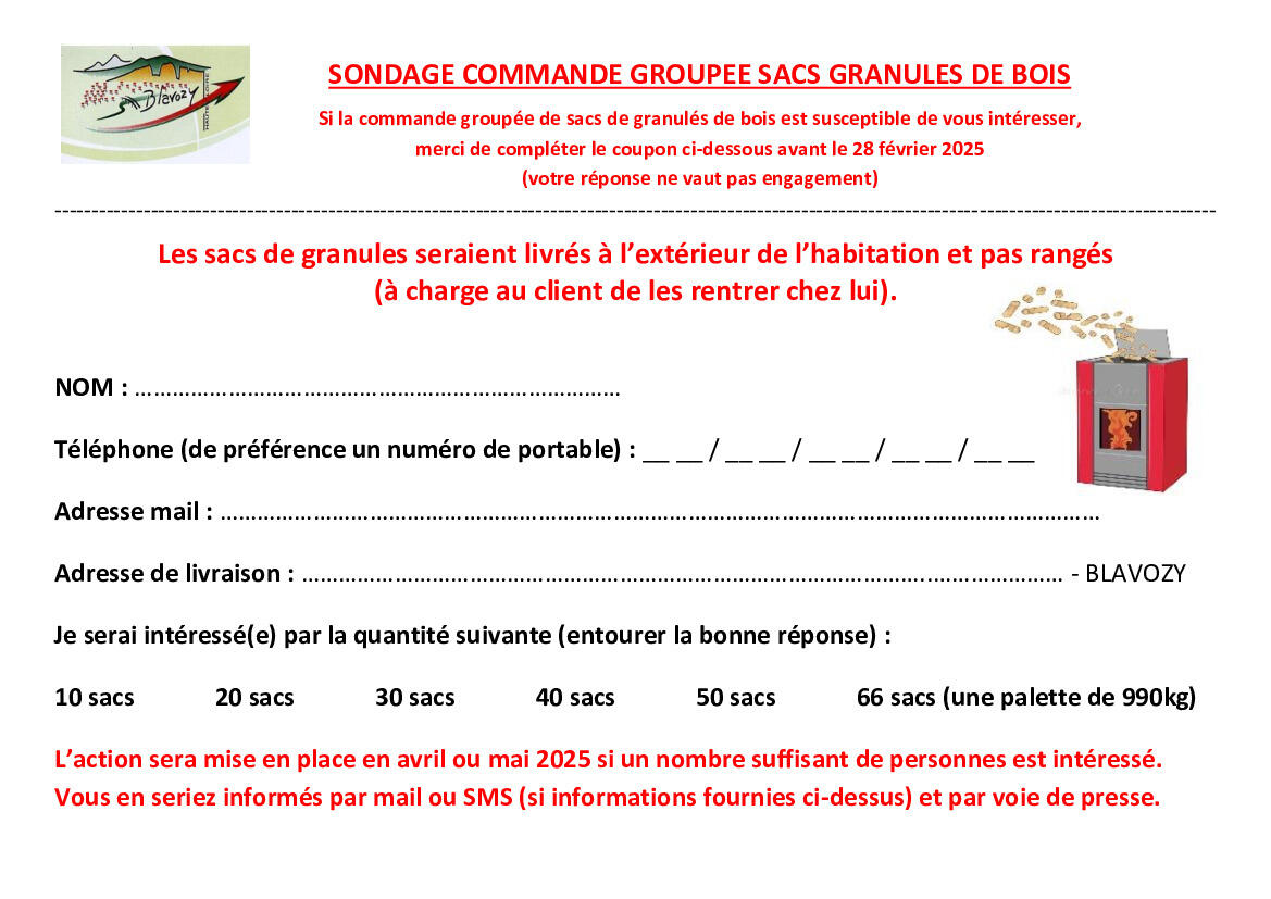 Afin de répondre aux besoins de la population, le C.C.A.S. envisage de proposer une commande groupée de sacs de granulés bois. Afin de voir si cette proposition concerne de nombreux foyers et si vous êtes intéressés, merci de compléter le coupon ci-joint (également disponible sur le bulletin municipal ou à l'accueil de la mairie).