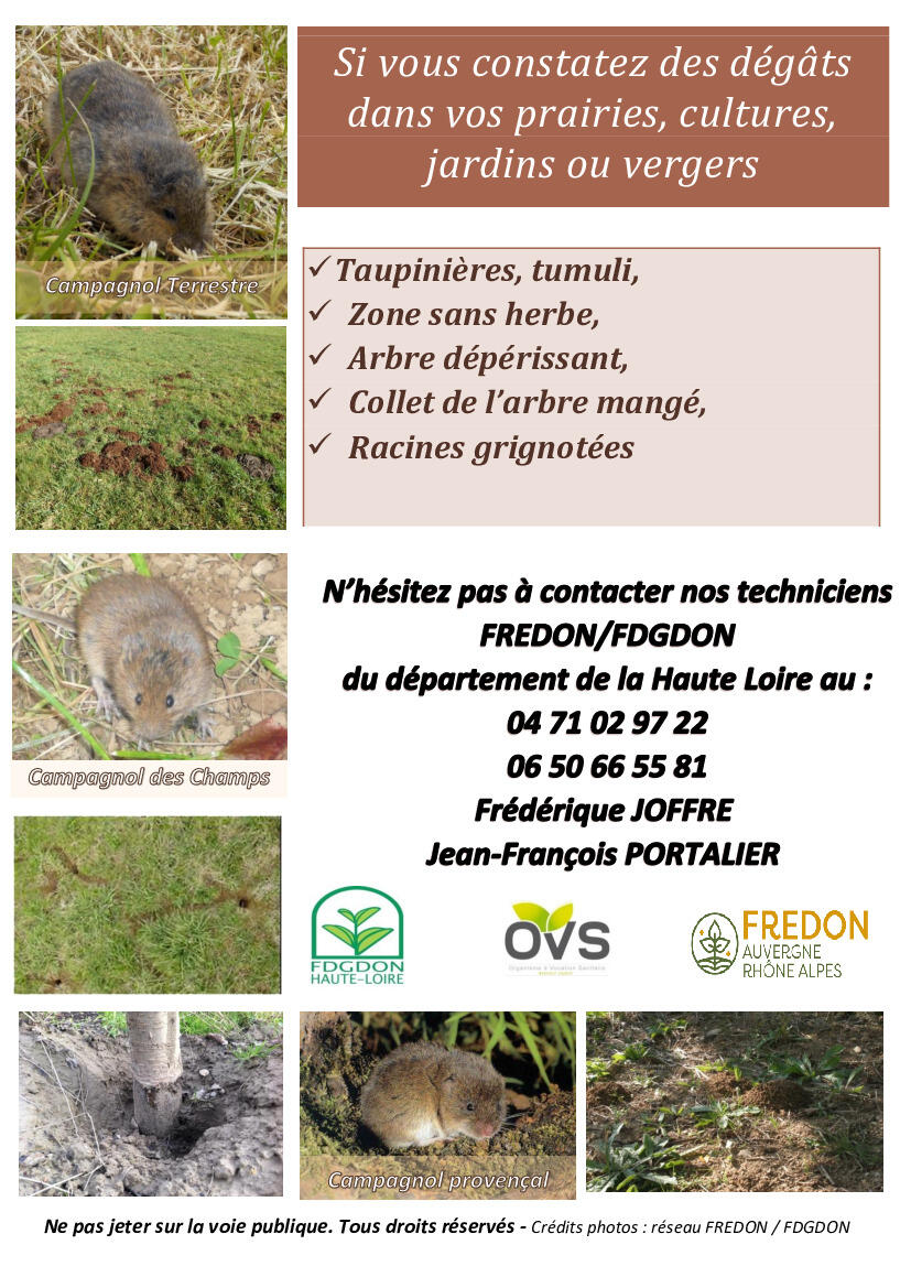 Dans le cadre d'une campagne de sensibilisation sur les problèmes occasionnés par les campagnols sur le territoire de la Haute Loire, la FDGDON a mis en place un nouveau service à destination des collectivités locales.